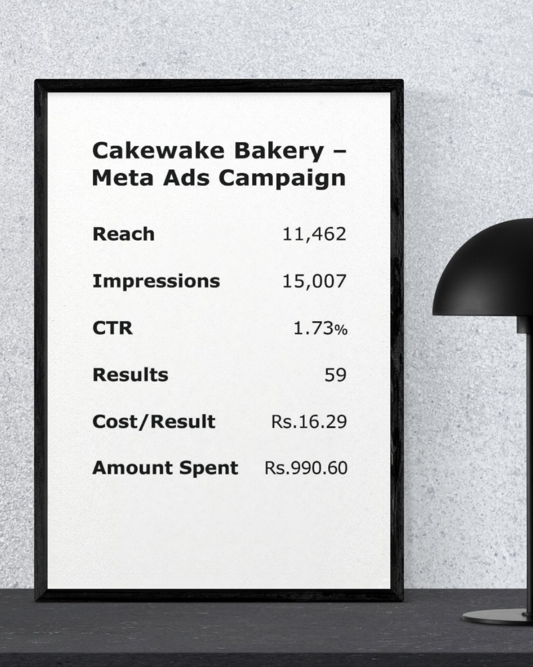 Planned and executed a Meta Ads campaign, achieving 11.4k reach, 15k impressions, and 1.73 CTR by optimizing the budget for a local home bakery named CakeWake.